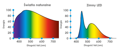 Na poniższym wykresie możesz zobaczyć, jak różni się światło naturalne od światła emitowanego przez zimne LED-y