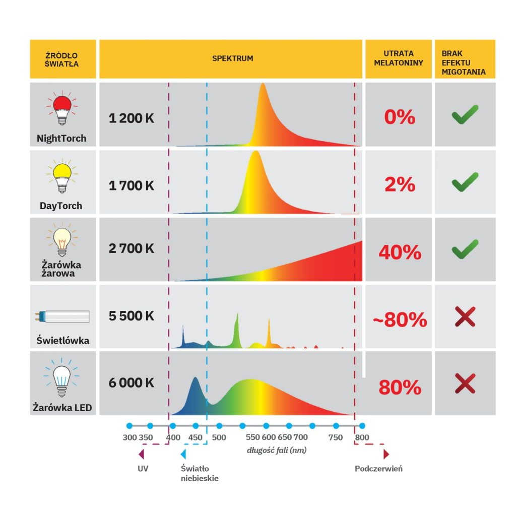 Czerwona żarówka NightTorch oraz pomarańczowa żarówka DayTorch to zdrowa alternatywa dla żarówek LED, które emitują sztuczne niebieskie światło. Zastosowane specjalne diody likwidują efekt migotania, dzięki czemu oczy nie męczą się. Światło ciepłe sprawia, że higiena snu jest zachowana. Czerwona żarówka to świetny wybór do pomieszczeń, w których przebywasz przed snem: do sypialni albo łazienki. Czerwone światło żarówki poprawia jakość snu poprzez regulację produkcji melatoniny i obniżenie poziomu kortyzolu. Z kolei pomarańczowa żarówka zastępuje “zwykłe” żarówki LED, które zapewne masz w salonie, pokoju dziecięcym, korytarzu. Przyjemna barwa sprawi, że będziesz bardziej zrelaksowany i spokojniejszy. Kolejnym skutecznym rozwiązaniem wobec ekspozycji na sztuczne światło wieczorem są okulary blokujące światło niebieskie. Nie musisz wymieniać wszystkich żarówek w domu, jeśli nosisz wieczorem okulary NightShield, najlepiej na 3-4 godziny przed snem. Pomarańczowe okulary skutecznie blokują światło niebieskie, co prowadzi do poprawy snu, zwiększenia poziomu melatoniny, zmniejszenia poziomu kortyzolu, zmniejszenia zmęczenia oczu i poprawy funkcji poznawczych.